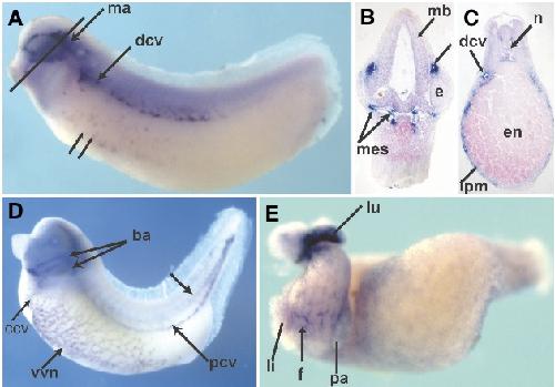 Fig. 2. Developmental expression of C1qR. Anterior is to the left and dorsal to the top unless otherwise specified. (A) Tailbud embryo. Marked expression in the mandibular seg- ment of the neural crest is indicated (ma). Double arrows indicate punctate ventral staining consistent with early vascular precursor expression. Expression in the dorsal cardinal vein is indicated (dcv). (B) Transverse section through the head of embryo in (A) (solid black line). Dorsal is to the top. The developing mesencephalon or mid-brain is labeled (mb). The small arrow to the right of the figure points to mandibular segment expression, dorsal to the developing eye (e). Expression in the head mesenchyme is shown, onsistent with neural crest expression. (C) Section through the trunk of a tailbud embryo (shown in D). Dorsal is to the top. The dorsal cardinal vein is indicated (dcv). Small struc- tures with a lumen in the lateral plate mesoderm (lpm) are consistent with expression in the developing vessels of vitelline network (vvn); (en) endoderm, (n) notochord. (D) Tailbud embryo showing expression throughout the devel- oping vasculature. In addition to the ventral vitelline net- work, both the common (ccv) and the posterior (pcv) cardinal veins show strong expression. There is some expression in the intersomitic veins as indicated by the small arrow. Expression in the branchial arches is labeled (ba). (E) Expression in the vasculature of the larval gut. The reticular pattern of the developing splanchnic vasculature is indicated in the foregut (f) but visible throughout, including in the liver and pancreatic buds. Expression is strongest in the lung bud. (li) liver, (lu) lung, (pa) pancreas. |