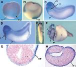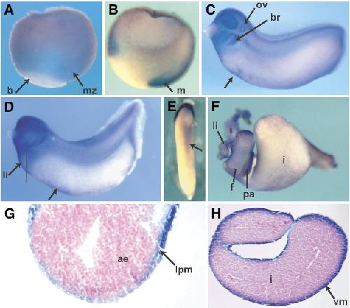 Fig. 4. Developmental expression of C3aR from gastrula to organ bud stage. (A) Whole mount in situ hybridization on a stage 10 gastrula showing expression predominantly in the marginal zone (mz); (b) blastopore. (B) Bissecting the gastrula revealed that the expression is mesodermal (m). In both (A,B) dorsal is to the right. (C) Stage 25 embryo showing expression in both the branchial segment of the neural crest (br) and in the otic vesicle (ov). Anterior is to the left, dorsal to the top. The arrow indicates early ventral blood island expression (VBI). (D) Stage 32 embryo. In addition to strong expression in cephalic structures, the presumptive liver area (li) is sur- rounded by cells expressing C3aR message. Arrow shows VBI expression. (E) Ventral view of same stage 32 embryo showing detail of VBI expression (arrow); head is to the top. (F) Isolated gut tube showing C3aR expression throughout the foregut (f) and presumptive intestine (i), (pa) pancreas. Anterior is to the left. (G) A section through the presumptive liver area (indicated in D) shows expression in lateral plate meso- derm (lpm) surrounding the anterior endoderm (ae). (H) Section through isolated gut showing staining in visceral mesoderm (vm), surrounding the presumptive intestine. |