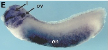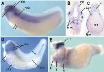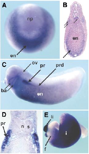 strong expression in the developing kidney. Dorsal is to the top; (n) notochord, (s) somite. (E) Isolated larval gut reveals strong expression in presumptive intestine (i) and liver (li), but no expression in foregut (f) and distal most segment of the developing intestine. |