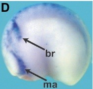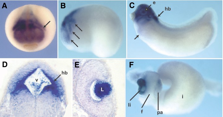 Fig. 6 (Right). Developmental expression of Properdin. Anterior is to the left and dorsal to the top unless otherwise specified. (A) Anterior view of a neurula stage embryo. Arrow indicates neural crest expression. (B) Late neurula/early tadpole stage embryo. Arrows indicate expression in mandibular, hyoid and mandibular segments of anterior neural crest (from anterior to posterior). (C) Tailbud embryo shows strong cephalic expression. Intense expression in developing eye (e) and hindbrain (hb) are indicated. The ventral arrow highlights beginning expression in the anterior endoderm. (D) Cross section through the hindbrain of the embryo in (C). Dorsal is to the top. Expression is limited to the dorsal most part of the neural tube, in the periventricular cells of the hindbrain; (v) ventricle. (E) Section through the developing eye of a tailbud embryo shows strong expression in the lens. Anterior is to the right. (F) In the isolated larval gut expression is confined to the liver bud only (li); (f) foregut, (i) presumptive intestine, (pa) pancreas. |