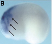 cfi (complement factor I) gene expression in Xenopus laevis embryo via in situ hybridization, NF stage 14, anterior view, dorsal up. |