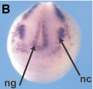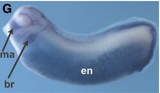 Fig. 7. Developmental expression of C9 from gastrula to organ bud stage. Anterior is to the left and dorsal to the top unless otherwise indicated. (A) Dorsal view of stage 10 embryo showing early spotted expression dorsal ectoderm. Anterior is to the top. (B) Anterior view of stage 17 embryo showing discrete neural crest (nc) and neural groove expression (ng). (C) Anterior view of stage 19-20 embryo. The three segments of the anterior neural crest show discrete expression at this stage. Mandibular segment ex- pression surrounds the presumptive eye field (e). (D) Lateral view of stage 22 embryo shows expression in mandibular (ma) and branchial segments (br) of anterior migrating neural crest. There is discrete hyoid expression noticeable between those two seg- ments. (E) Stage 27 embryo. Neural crest expression is seen in all three segments, as well as in the otic vesicle (ov), the lens (l), and the endoderm (en). (F) Stage 35 embryo shows strong liver and endodermal expression. (G) Isolated gut tube shows liver (li) and intestinal expression sparing the foregut (f), but no distal intestinal (proctodeum) expression (arrow); (lu) lung, (pa) pancreatic bud. |