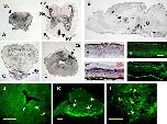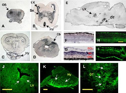 Figure 2. A-L: Expression of Xvax2 as detected by in situ hybridization (A-G) and immunohistochemistry (H-L) in the adult Xenopus retina (F-I) and brain (A-E,J-L). Xvax2 mRNA localization (indicated by arrows) was detected on serial transversal sections of adult Xenopus brain at different anteroposterior levels (A-D) or on sagittal sections near the midline (E,J-L). F and G show the dorsal and ventral parts of coronal sections of the adult retina, respectively. H and I show sections corresponding to F and G, respectively. Cb, Cerebellum; Hy, hypophysis; HV, hypothalamic ventricle; LV, lateralventricle; Se, Septum; OB, olfactory bulb; OT, optic tract; GCL, ganglion cell layer; INL, inner nuclear layer; ONL, outer nuclear layer. Scale bars = 100 mu m.