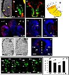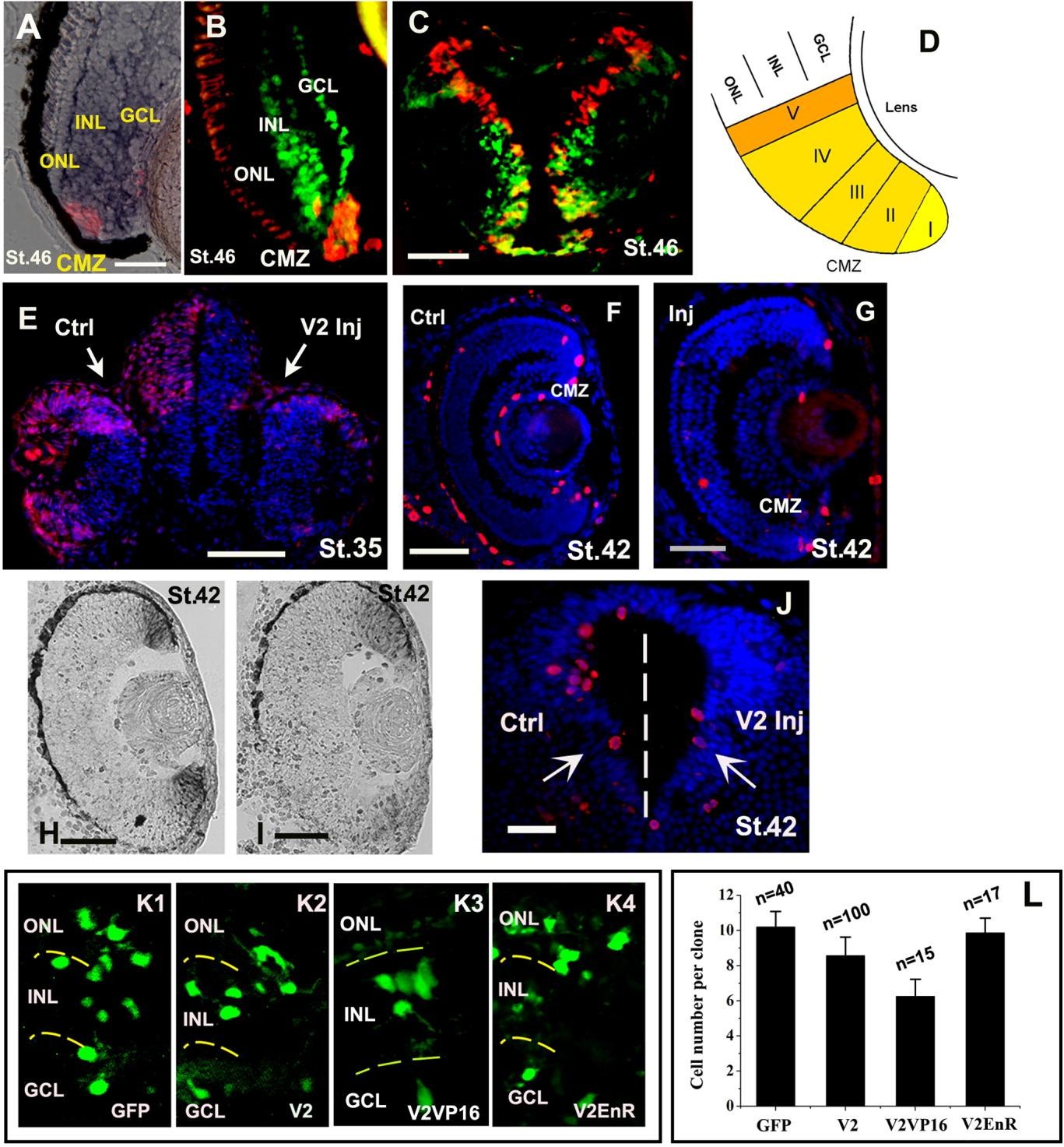 Figure 3. A-C: Double staining for bromodeoxyuridine (BrdU) incorporation (red) and Xvax2 expression in the ventral CMZ of Xenopus retina (A,B) and the ventricular zone of brain (C) at st. 46. Location of Xvax2 mRNA (A) and protein (B,C) is shown in blue and green as detected by in situ hybridization and immunohistochemistry, respectively. D: A schematic model of the CMZ subdivision in Xenopus retina. Zone I, II-III and IV-V represent stem cells, proliferating retinoblasts, and postmitotic cells, respectively (Ohnuma S, et al.,[2002], reproduced with permission of the Company of Biologists). E-J: Analysis of cell cycle activity in the control (Ctrl) and 50 pg Xvax2-injected (Inj) side of Xenopus embryos as detected by immunohistochemistry (E-G,J) and in situ hybridization (H,I). Cell cycle activity (red) was detected by BrdU incorporation (E), anti-phosphohistone-H3 (F-G,J) and cyclinD1 expression (H, I) on coronal sections of eye (E-I) and forebrain (E,J) at st. 35 and st. 42. Cell nuclei are shown in blue by Hoechst staining (E-G,J). K,L: Gain-/loss-of-functional effects of Xvax2 on clonal sizes of retinal cells. The fluorescent image shows lipofected cells in retinal sections at stage 42, after transfection of GFP (K1) or cotransfection of GFP with Xvax2 (V2) construct Xvax2 (K2), Xvax2-VP16 (K3), Xvax2-EnR (K4) at st.17/18. L: Quantification of retinal clonal size is shown. Error bars represent standard error of the mean (SEM). Clone counts are indicated on each column. CMZ, ciliary marginal zone; ONL, outer nuclear layer; INL, inner nuclear layer; GCL, ganglion cell layer; Scale bars = 100 mu m.
