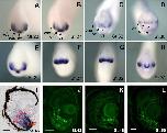 Figure 1. A-L: Expression of Xvax2 as detected by immunohistochemistry (A-D,J-L) and in situ hybridization (E-I) on whole embryos (A-H) and coronal sections of eye (I-L) of Xenopus laevis. The developmental stages (St.) are indicated in each panel. Whole embryos are shown as anterior views, and the sections with dorsal side up. op, olfactory placode; pos, presumptive optic stalk; vov, ventral optic vesicle; voc, ventral optic cup; vt, ventraltelencephalon; CMZ, ciliary marginal zone; GCL, ganglion cell layer; INL, inner nuclear layer; ONL, outer nuclear layer. Scale bars = 100 mu m.