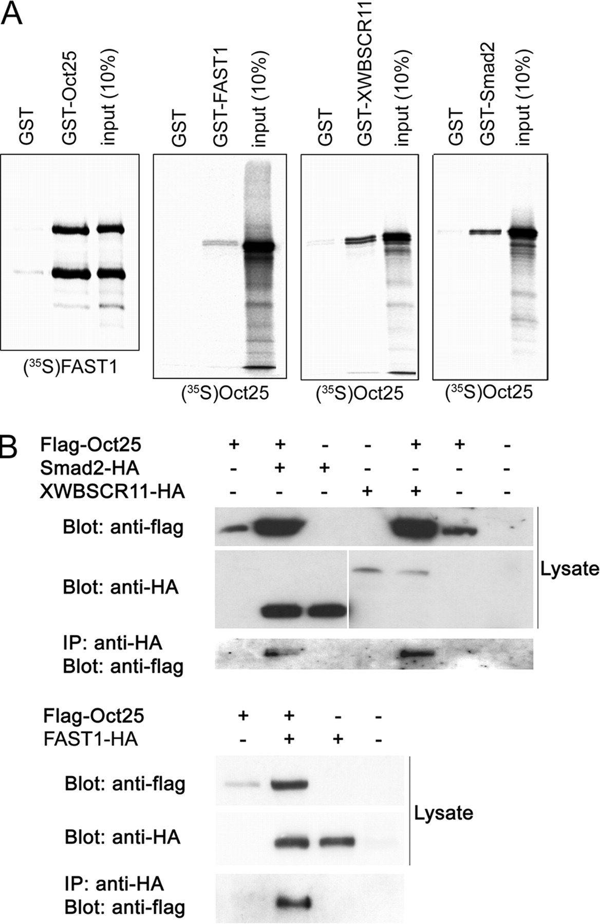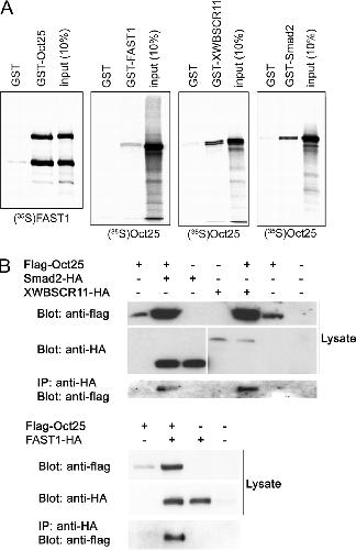 Physical interactions between Oct25 and FAST1, Smad2, or XWBSCR11. A, GST pull-down assays reveal that Oct25 interacts with FAST1 (and vice versa), XWBSCR11, and Smad2. B, in transfected cells, Flag-tagged Oct25 formed complexes with HA-tagged Smad2, XWBSCR11, or FAST1 as displayed by precipitation with an anti-HA antibody.