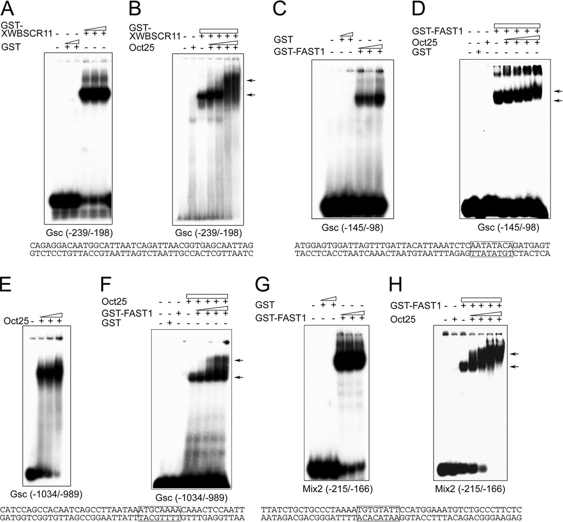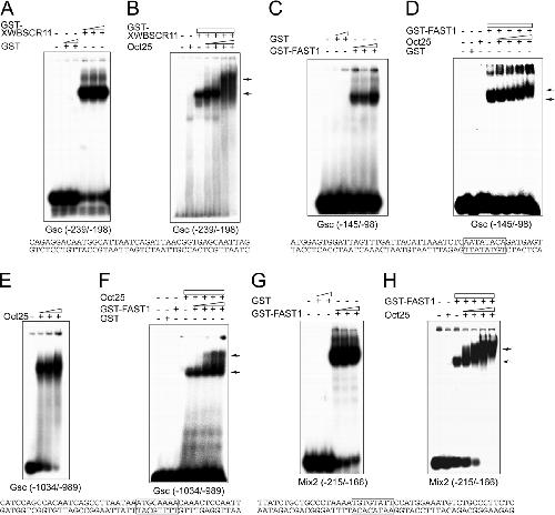 In vitro binding of Oct25 to Gsc and Mix2 promoters. A, increasing amounts of a GST-tagged XWBSCR11 fusion protein bind to an oligonucleotide containing the DE of the Gsc promoter (position -239 to -198), while GST itself does not show any binding. B, increasing amounts of Oct25 and GST-XWBSCR11 form a complex on the DE as displayed by a supershift. C, FAST1 specifically binds to an oligonucleotide containing the PE of the Gsc promoter (position -145 to -98) with a FAST1 binding motif. D, Oct25 forms a complex with FAST1 on the PE as revealed by supershifts. E, Oct25 binds to an oligonucleotide (position -1034 to -989) of the Gsc promoter containing an octamer-like motif. F, incubation of this region of the Gsc promoter with Oct25 and increasing amounts of GST-FAST1 fusion protein leads to a supershift. G, FAST1 interacts with the ARE of the Mix2 promoter (position -215 to -166) that contains a FAST1 binding motif. H, supershift generated with GST-FAST1 and increasing amounts of Oct25. The sequences corresponding to the regions of Gsc and Mix2 promoters used for EMSA and supershift assays are listed below each panel and protein binding motifs for FAST1 or Oct25 are boxed. The arrows denote supershifting.