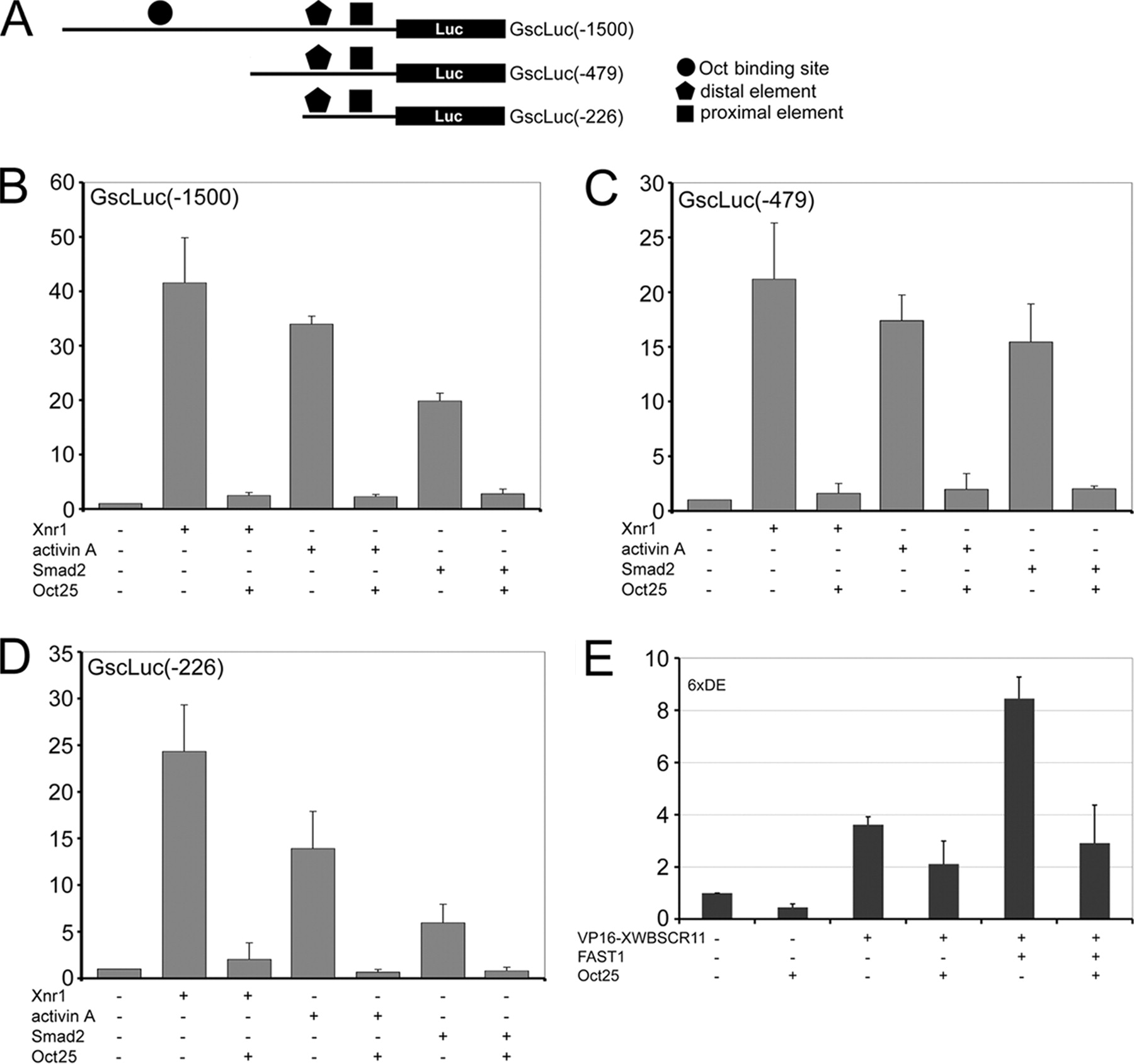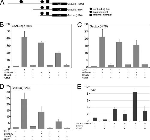 Gsc promoter assays. A, diagram depicting the generation of Gsc promoter-luciferase reporter constructs. B, Oct25 represses Gsc -1500/+3 promoter activities stimulated by overexpression of Xnr1, Smad2, or by incubation with activin A protein. C and D, the same effect is observed for truncated promoters -479/+3(C) and -226/+3(D). E, VP16-XWBSCR11 alone or together with FAST1 stimulates an artificial reporter for DE, which is then repressed by Oct25.