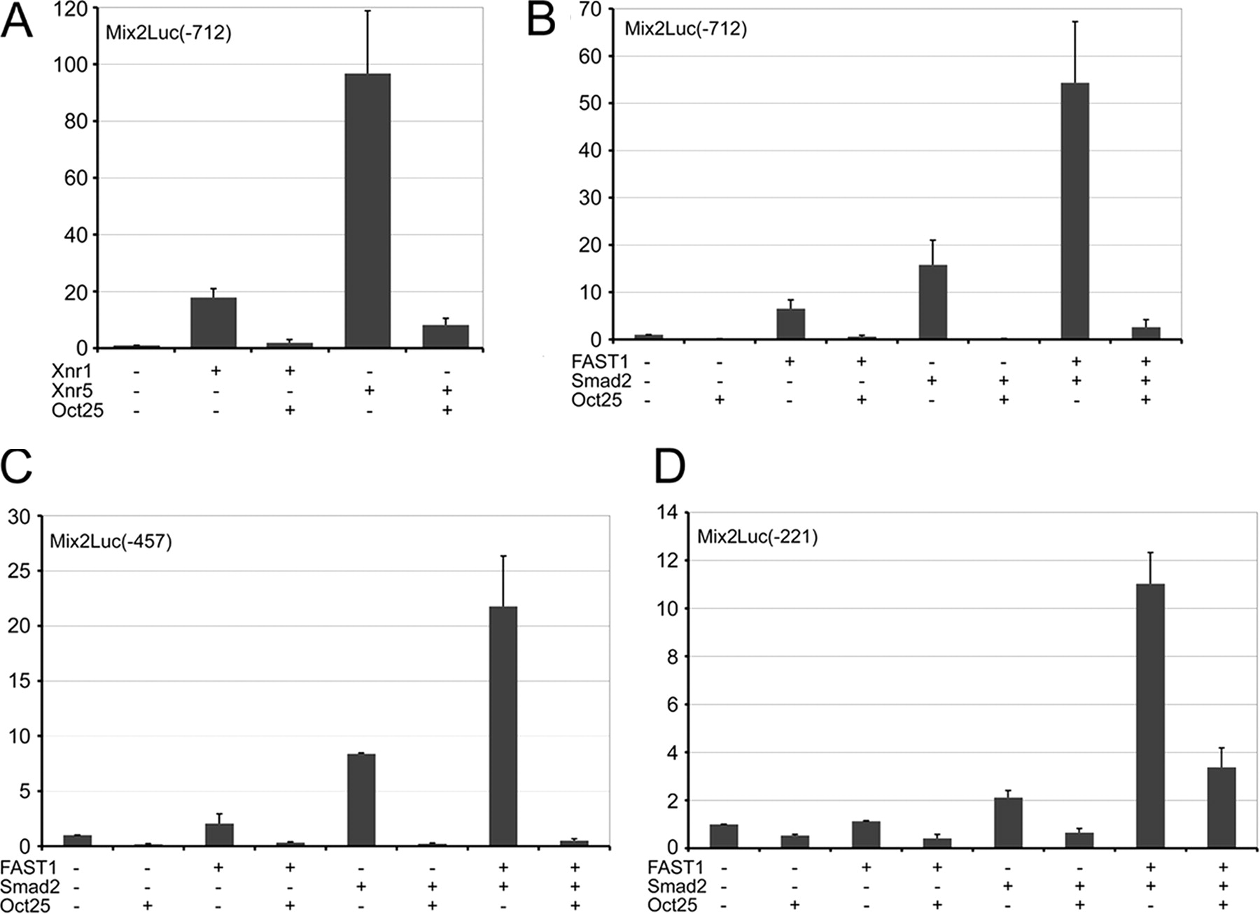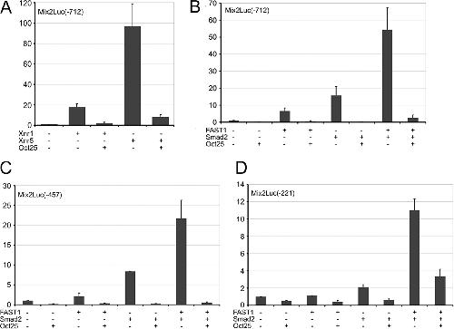 Mix2 promoter assays. A and B, Oct25 inhibits Mix2 -712/+13 promoter activity stimulated not only by overexpression of the ligand of nodal signaling, Xnr1 or Xnr5 (A), but also by overexpression of the transducers, Smad2 and/or FAST1 (B). C and D, Oct25 shows a repressive effect on the truncated Mix2 promoters -457/+13 (C) and -221/+13 (D), which are stimulated by Smad2 and/or FAST1.