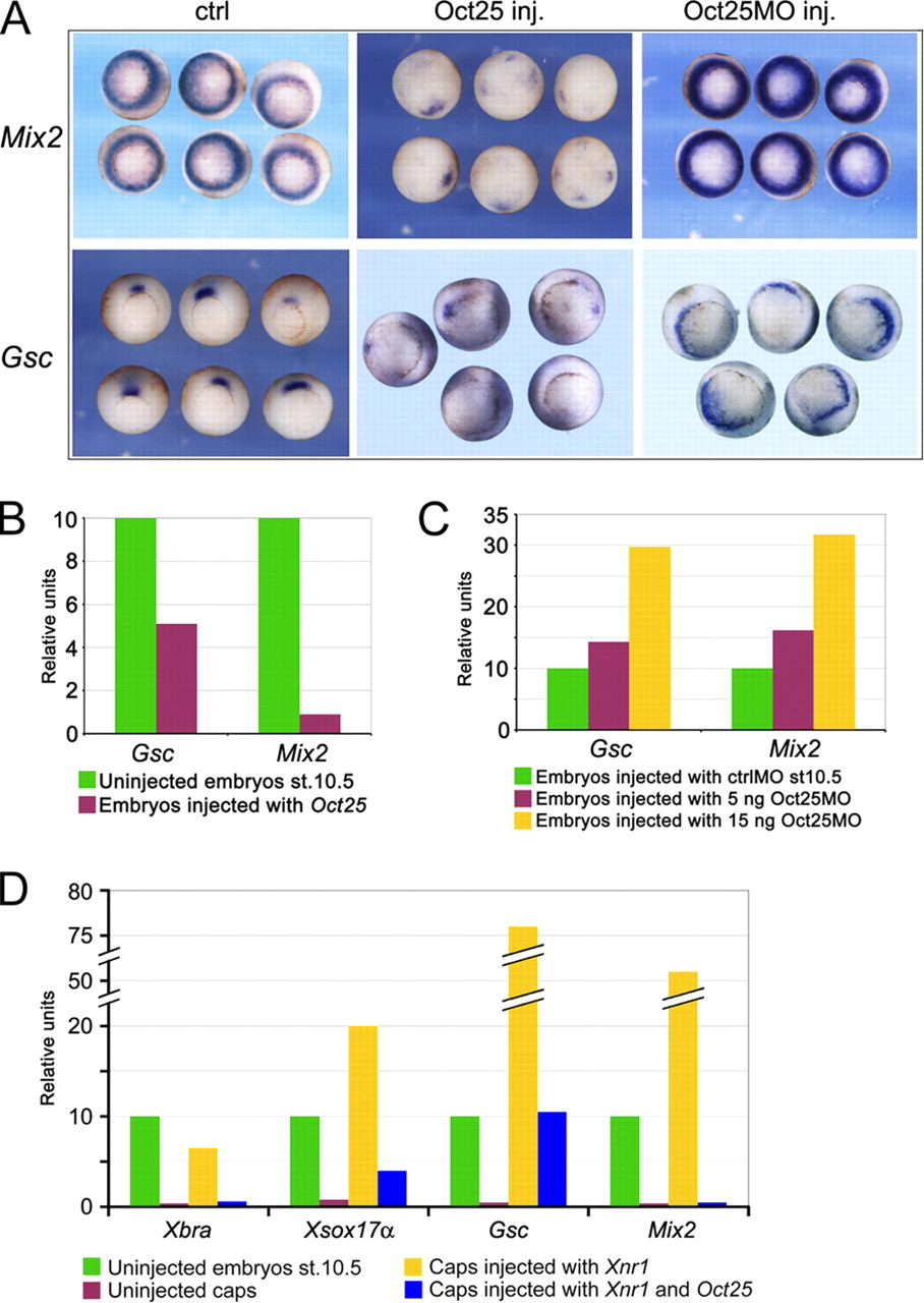 Analysis of Gsc and Mix2 transcription in response to Oct25 overexpression or knockdown. AâC, whole mount in situ hybridization (A) or real-time RT-PCR in whole embryos (B and C) reveal an inhibition of Gsc and Mix2 by Oct25 gain of function and a dose-dependent increase in transcription of both genes by Oct25 loss of function. D, real-time RT-PCR shows that transcription of mesodermal and endodermal markers Xbra, Gsc, Xsox17a, and Mix2 is strongly enhanced in animal caps from embryos injected with Xnr1 mRNA, but is severely inhibited by co-injection with Oct25 mRNA.