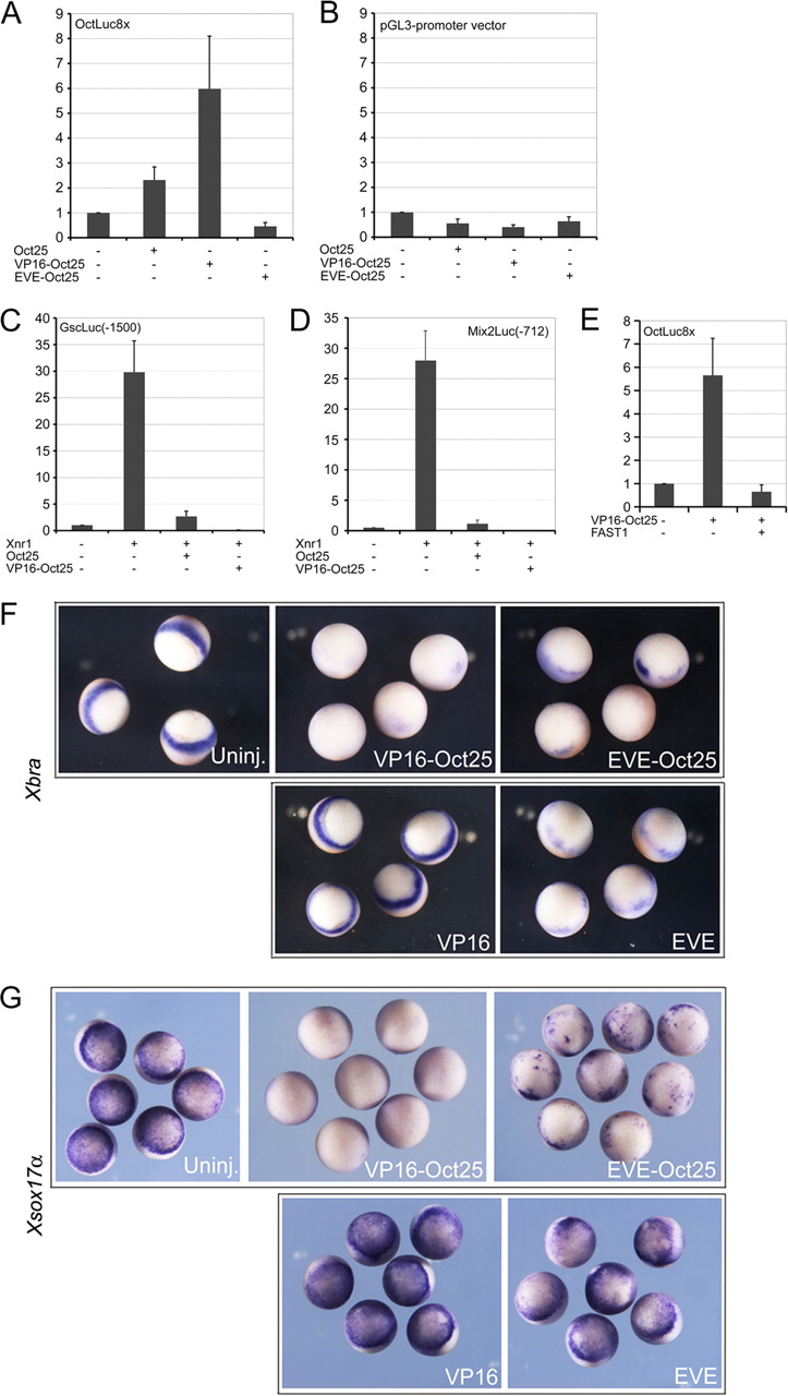 Analysis of Oct25 VP16 and EVE fusions on promoter activity and mesendoderm formation. A, wild-type Oct25 and VP16-Oct25 stimulate in contrast to EVE-Oct25 an artificial octamer reporter, suggesting that Oct25 is a transcriptional activator with regard to its octamer binding property. B, the controls demonstrate that stimulation is not due to the pGL3 vector, to which the octamer motifs were ligated. C and D, both Oct25 and VP16-Oct25 reveal repressive effect on Gsc (C) and Mix2 (D) promoters. E, stimulation of octamer reporter by VP16-Oct25 is inhibited by FAST1. F and G, either or revealed inhibition of Xbra (F) and Xsox17α (G), while in controls, the VP16 alone had no effect and EVE alone had weak effect on the expression of the two genes.