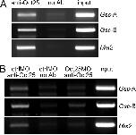 In vivo interaction of Oct25 to Gsc and Mix2 promoters. A, ChIP assays demonstrate that Gsc promoter regions containing either the Oct25 binding site (Gsc-A) or containing the DE and PE (Gsc-B) as well as the Mix2 promoter region spanning the ARE were amplified from chromatin precipitated by an Oct25 antibody. This amplification failed in the absence of antibody (no Ab). B, when Oct25 translation was blocked by Oct25MO, PCR products for Gsc and Mix2 promoter regions were reduced as compared with ctrlMO injections.
