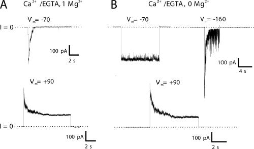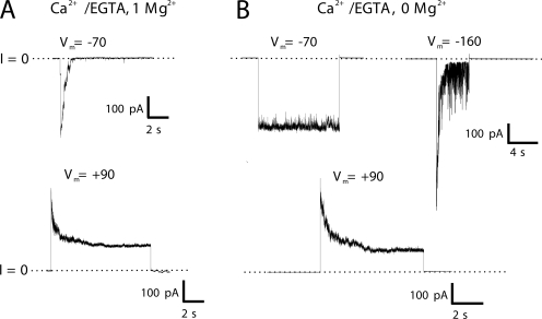 Figure 3. Voltage gating is intrinsic to Cx46 hemichannels. Shown are multichannel cell-attached patch recordings from a Cx46-expressing oocyte with (A) 1 mM Mg2+ present in the patch pipette and (B) with no added Mg2+ in the patch pipette. In both cases, Ca2+ was buffered to very low levels with EGTA. When the extracellular solution (patch pipette solution) contained 1 mM Mg2+, membrane hyperpolarization to −70 mV and depolarization to +90 mV produced reductions in current characteristic of loop gating and Vj gating, respectively. Currents were leak subtracted (dotted lines designate the 0 current level). When the extracellular solution was essentially devoid of external divalent cations, Vj gating at +90 mV was unaffected and loop gating at −70 mV was abolished, but application of a very large hyperpolarizing step to −160 mV caused a robust and rapid decrease in current. Although the current clearly declined toward zero, it remained very flickery and noisy. All currents were filtered at 1 kHz and data were acquired at 5 kHz.