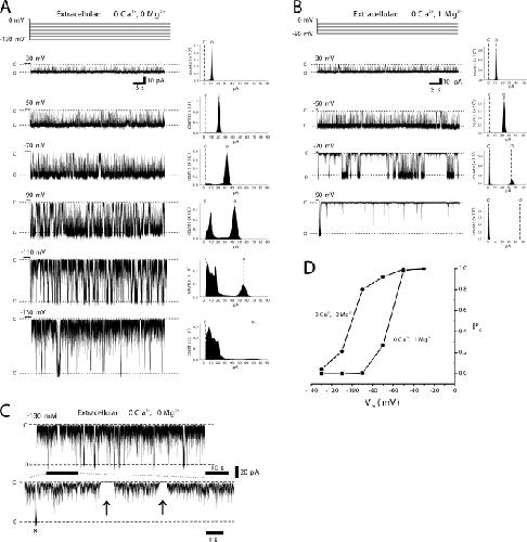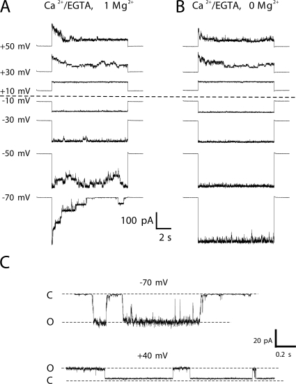 Figure 2. Divalent cations selectively affect gating of Cx46 hemichannels at negative membrane potentials. (A and B) Multichannel cell-attached patch recordings from a Cx46-expressing oocyte recorded with (A) 1 mM Mg2+ present in the patch pipette and (B) no added Mg2+ in the patch pipette. In both cases, Ca2+ was buffered to very low levels with EGTA (Materials and methods). Shown are currents in response to 10-s voltage steps from −70 and +50 mV applied in 20-mV increments. No endogenous channel activity was present these patches. In the presence of 1 mM external Mg2+, Cx46 hemichannels essentially remained open at modest voltages (see traces at −10 and +10 mV) and tended to close for either polarity of membrane voltages. Hyperpolarization led to full and robust closure (see trace at −70 mV), whereas depolarization left a residual current (see current trace at +50 mV). The current records were leak subtracted as described in the Materials and methods. When there was no added external Mg2+, gating at positive voltages did not change, whereas gating at negative voltages changed significantly. In the example shown, gating was essentially abolished at hyperpolarizing voltages up to −70 mV. (C) Cell-attached patch recordings of single Cx46 hemichannels highlighting the two different types of gating at negative (−70 mV) and positive (+40 mV) voltages, termed loop gating and Vj gating, respectively. Recordings were obtained with standard IPS (containing 1 mM Mg2+). Loop gating is characterized by gating transitions between fully closed (C) and open (O) states (left), whereas Vj gating transitions occur between the open state (O) and a long-lasting subconductance state (right). Currents were leak subtracted as described in Materials and methods. All currents were filtered at 1 kHz and data were acquired at 5 kHz.