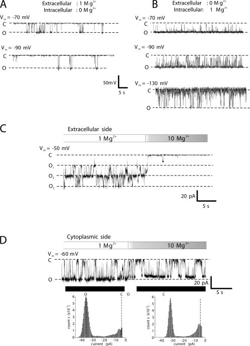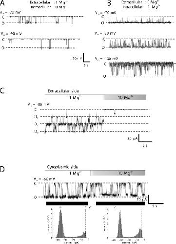 Figure 5. The binding site for divalent cations is extracellular. (A) Recording of a single hemichannel in an outside-out patch configuration with 1 mM Mg2+ on the extracellular side and no added Mg2+ on the cytoplasmic side. Openings observed at −70 mV became more sporadic and brief upon hyperpolarization to −90 mV. (B) Recording of a single hemichannel in an outside-out patch configuration with no added Mg2+ on the extracellular side and 1 mM Mg2+ on the cytoplasmic side. In the presence of 1 mM Mg2+ on the cytoplasmic side, the hemichannel largely remained open at −70 mV. Closure increased with hyperpolarization to −90 mV and was robust at −130 mV. These large hyperpolarizing voltages would tend to prevent Mg2+, which is present only on the cytoplasmic side, from entering the pore inconsistent with voltage-dependent entry of Mg2+ leading to block. (C) Patch recording containing three active Cx46 hemichannels in an outside-out patch configuration. Membrane potential was held constant at −50 mV. Starting in symmetric conditions, with 1 mM Mg2+ present on both sides, perfusion of a solution containing 10 mM Mg2+ into the bath (as indicated), which exposed the extracellular side to a high concentration of Mg2+, produced rapid and robust closure. (D) The same experimental paradigm as in C applied to an inside-out patch containing a single hemichannel. Perfusing a solution containing 10 mM Mg2+ into the bath, which now exposed the cytoplasmic side to a high concentration of Mg2+, did not appreciably affect hemichannel behavior except for a small reduction in the magnitude of the unitary current. Shown below the recording are histograms taken from the indicated segments (solid bars) before and after application of 10 mM Mg2+. All currents were leak subtracted. Dashed lines indicate fully open (O) and fully closed (C) states. Currents were filtered at 1 kHz and data were acquired at 5 kHz.
