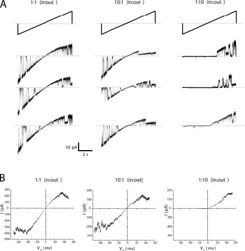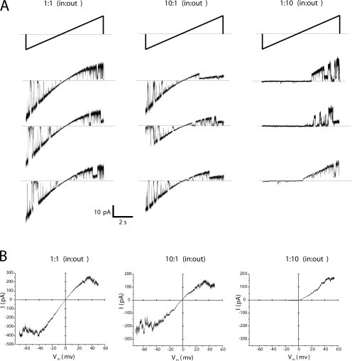 Figure 6. Examination of the effects of Mg2+ over a voltage range. (A) Single hemichannel currents obtained with 8-s voltage ramps from −70 to +70 mV applied to excised patches. Shown are examples of three current traces in response to voltage ramps applied in succession to a patch in which the Mg2+ concentration was 1 mM on both sides (left), elevated to 10 mM on the cytoplasmic (middle) and elevated to 10 mM on the extracellular (right). The currents were leak subtracted. (B) Current–voltage relationships of Cx46 hemichannels constructed from ensemble averaged currents from multiple patches in response to ±70 mV, 8-s voltage ramps applied to excised patches as shown in A. The I-V relationship with 10 mM Mg2+on the cytoplasmic side was essentially similar to that obtained in symmetric 1 mM Mg2+, except for a small reduction in unitary current and a small negative shift in Erev. In contrast, the same concentration of Mg2+ applied to the extracellular side showed strong voltage dependence with hemichannels closing at inside negative voltages and opening at positive voltages. The strong voltage dependence of closure observed only when Mg2+ is elevated extracellularly but not cytoplasmically argues against a pore-blocking mechanism and is consistent with an extracellular modulatory site, which when bound with divalent cations causes a positive shift in activation to more positive voltages.