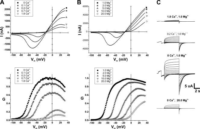Figure 1. Regulation of macroscopic Cx46 currents by external Ca2+ and Mg2+. (A) Representative current–voltage (I-V) relationships (top) at different external Ca2+ concentrations ranging from nominal (0 added) to 1.8 mM were obtained by applying slow (3 min) voltage ramps from +50 to −100 mV to a Cx46-expressing oocyte. The holding potential before and after the ramp was −40 mV. For each curve, external Mg2+ was maintained at 1 mM. The corresponding conductance–voltage (G-V) relationships are plotted below and show that conductance is maximum at or near 0 mV and decreases asymmetrically with voltages of either polarity. Conductance decreases robustly with hyperpolarization, but only modestly with depolarization. Increasing the extracellular Ca2+ concentration caused a significant decrease in overall conductance and led to a substantial rightward shift in voltage sensitivity at negative, but not positive potentials. (B) I-V (top) and corresponding G-V (bottom) relationships obtained at different external Mg2+ concentrations ranging from 1 to 20 mM. External Ca2+ was maintained at nominal levels. Increasing external Mg2+, like Ca2+, decreased overall conductance and caused a significant positive shift in voltage sensitivity at negative potentials. However, these changes required considerably higher concentrations of Mg2+. (C) Shown are representative currents obtained at different concentrations of external Ca2+ and Mg2+. Oocytes were clamped to a holding potential of −40 mV and 5-s voltage steps were applied from +60 to −100 mV followed by a 5-s step to −120. The currents were normalized to a constant prepulse (+10 mV) that preceded each episode. Both Ca2+ and Mg2+ had similar effects, suppressing the magnitude of the current, slowing activation and speeding up deactivation.