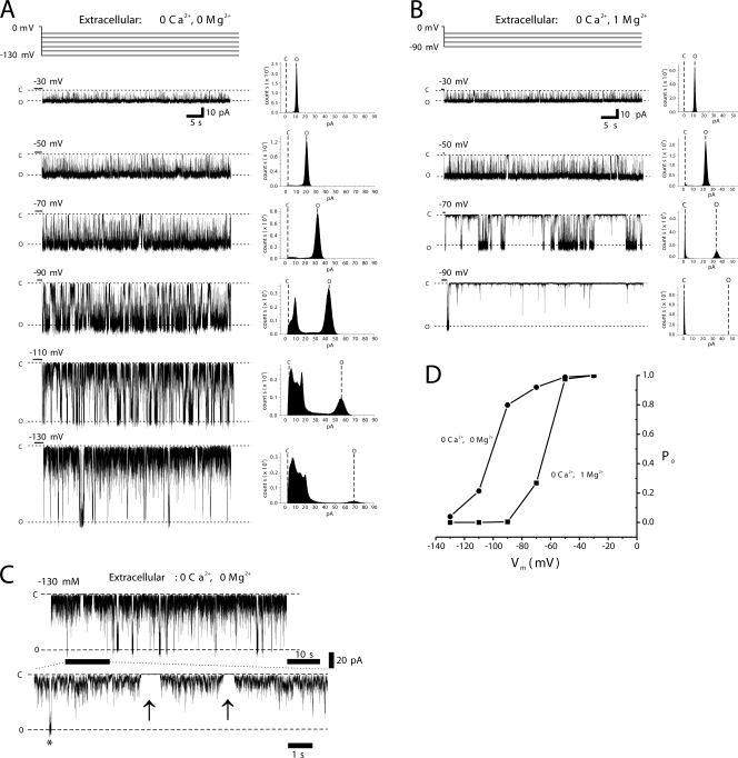Figure 4. External divalent cations stabilize loop-gating closures induced by hyperpolarization. (A–C) Recordings of a single Cx46 hemichannel in an excised outside-out patch. The patch pipette solution contained standard IPS solution (Materials and methods). (A) Recordings obtained with no added Mg2+ on the extracellular side (bath) of the hemichannel. Shown are 30-s segments of current recorded at membrane potentials of −30, −50, −70, −90, −100, and −130 mV. All points histograms obtained from longer (60–120 s) recordings are shown to the right of each trace. Dashed lines designated C and O in the current traces and the corresponding histograms represent fully closed and fully open states, respectively (currents were not leak subtracted). In the absence of divalent cations, the hemichannel clearly exhibits voltage dependence with hyperpolarization tending toward closure. At large hyperpolarizing voltages, the hemichannel rarely resides in the fully open state and exhibits very noisy flickering (see spread in the histograms away from the fully closed state). (B) Addition of 1 mM Mg2+ to the bath dramatically changed the behavior of the hemichannel. Stable, long-duration closures became evident and considerably more modest voltages produced closure (compare histograms at −90 mV with and without added Mg2+). (C) View of the current trace recorded at −130 mV with no added Mg2+ at an expanded time scale. The solid bar indicates the segment of the trace that was expanded below. The noisy flickering associated with closure can be seen to be occasionally interrupted by full closures that are quiet (indicated by arrows). Asterisk denotes a brief opening event. (D) Plots of Po vs. Vm obtained from the recordings in A and B. Po represents the fraction of time spent in the fully open state (see Materials and methods). These data illustrate that in solutions essentially devoid of divalent cations, voltage dependence remains robust although significantly shifted in the hyperpolarizing direction. Currents were filtered at 2 kHz and data were acquired at 10 kHz.
