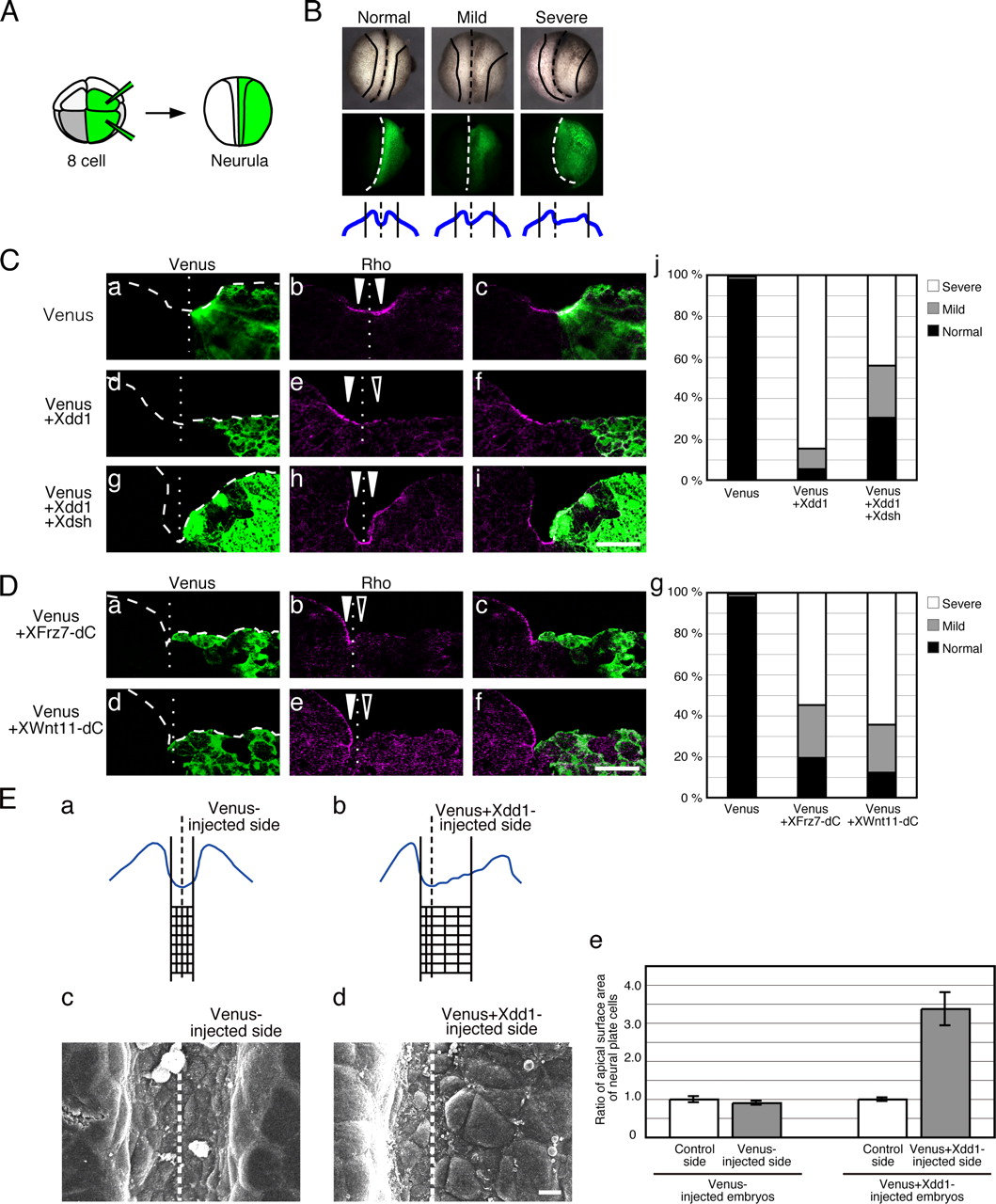 Figure 7. Inhibition of Wnt/PCP pathway causes neurulation defects and disrupts the apical accumulation of Rho in neural plate cells in Xenopus embryos. (A) mRNA injection experiment in embryos. mRNA was injected into two right-side blastomeres of the animal hemisphere at the eight-cell stage. Venus mRNA (50 pg) was coinjected as a marker. At the neurula stage, injected mRNA was distributed mainly to the right side of the ectoderm. (B) Phenotypes of embryos at the neurula stage producing mutant molecules that inhibit the Wnt/PCP pathway. Top row contains bright microscopy images; middle row shows images of Venus distribution; bottom row contains sketches depicting the morphology as transverse sections. Normal, a Venus-expressing control neurulaembryo. Mild and Severe, dominant-negative dishevelled (Xdd1)-expressing embryos with mild and severe phenotypes, respectively. In mild cases, the medial line is almost straight and the neural plate of the mRNA-injected side is broader than that of uninjected control side. In severe cases, medial lines are curved toward the injected side, and the neural plates of the injected side are much broader than those of the control side. Black lines indicate sides of neural folds. Dotted lines represent medial line of embryos. (C) Transverse sections of control (aâc), Xdd1 mRNA (200 pg)-injected (dâf), and Xdd1 plus wild-type disheveled (Xdsh, 400 pg) mRNA-injected (gâi) embryos. Venus (a, d, and g), Rho (b, e, and h), and merged (c, f, and i) images. (j) Statistics of the phenotypes induced by Xdd1 injection and coinjection with Xdsh. Venus: n = 138; Venus + Xdd1: n = 130; Venus + Xdd1 + Xdsh: n = 102. (D) Transverse sections of XFrz7-dC mRNA (400 pg)-injected (aâc) and XWnt11-dC mRNA (400 pg)-injected (dâf) embryos. Venus (a and d), Rho (b and e), and merged (c and f) images. (g) Statistics of the phenotypes induced by Xfrz7-dC- or Xwnt11-dC-injection. Venus: n = 138; Venus + XFrz7-dC: n = 93; Venus + XWnt11-dC: n = 90. Broken lines in C and D represent outlines of neural plates. Dotted lines represent medial lines of embryos. (C and D) Arrowheads, the region of apical accumulation of Rho; open arrowheads, disruption of apical accumulation of Rho. Scale bars, 50 μm. (E) Dorsal views of neural plate cells in control and Xdd1 mRNA-injected embryos. (a and b) Arrangements of neural plate cells of (a) Venus- and (b) Venus + Xdd1 mRNA-injected Xenopus embryos. (c and d) Dorsal scanning electron microscopic views of the neural grooves of Venus- (c) and Venus + Xdd1 (d) mRNA-injected Xenopus embryos. Scale bar, 10 μm. (e) Statistics of apical surface area of neural plate cell. In the Xdd1-injected side, the apical surface area of neural plate cells is much larger than in the uninjected control side, whereas in Venus-injected embryos, neural plate cells on both sides have almost the same apical surface area. Venus: n = 20, 4 specimens; Xdd1: n = 20, 3 specimens. Bars, mean + SEM.