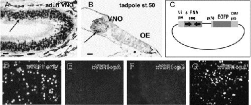 Expression of xV2RE in Xenopus VNOs and the silencing effect of siRNA-expressing plasmids on the expression of xV2R1 in 293T cells. Cross-sections of adult (A) and tadpole VNOs at stage 50 (B) were hybridized with digoxigenin-labeled V2RE-specific antisense probe as described previously [17]. A schematic illustration of the siRNA-expressing plasmid (C). Arrows in (A,B) indicate the sites of xV2R1 expression. Chimeric rhodopsin-xV2R1 plasmid was transfected into HEK 293T cells with pA (E), pB (F), pAⲠ(G) or without siRNA plasmid (D), and expression of xV2R1 was detected by anti-rhodopsin antibody as described in the Materials and methods. Black spots on the periphery of the OE and VNO in cross-sections (A,B) are melanocyte aggregates. Bars indicate 50 μm.