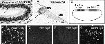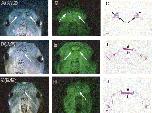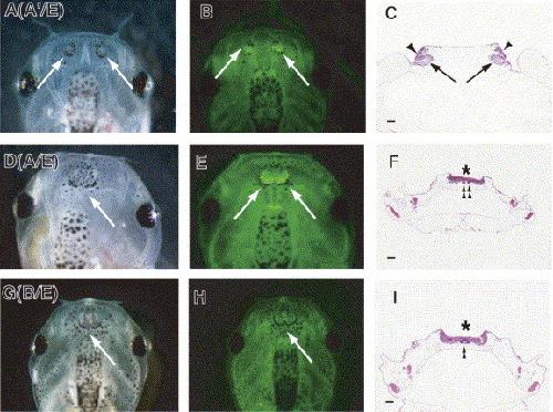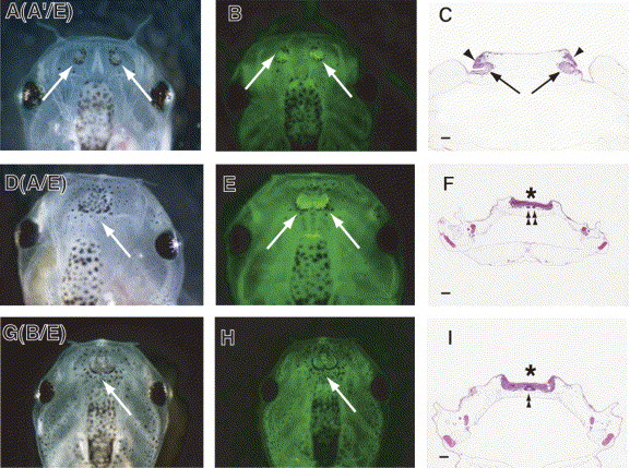 Morphological features of olfactory organs of transgenic tadpoles. Photographs of pAâ²/E-derived EGFP-positive tadpole with morphologically normal nostrils (A) and pA/E- (D) and pB/E (G) -derived EGFP-positive tadpoles with fused nostrils at stage 50â51 (white arrows indicate nostrils). EGFP expression in tadpoles of A (B), D (E), and G (H) was monitored using a fluorescent dissecting microscope (white arrows indicate OE). Paraffin-embedded sections (15 μm) of pAâ²/E-derived EGFP-positive tadpoles with normal nostrils (C) and pA/E- (F), pB/E (I) -derived EGFP-positive tadpoles with fused nostrils were stained with hematoxylin/eosin. The VNO (arrows), OE (arrowheads), fused OE (asterisks), and Jacobsonâs glands (double arrowhead) are shown. Bars indicate 50 μm.