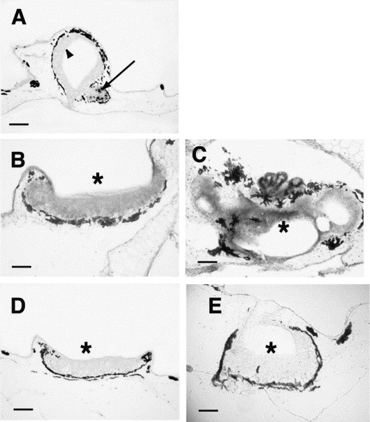 Expression of the xV2RE genes in the olfactory organs. Cross-sections of pA′/E-derived EGFP-positive tadpoles with normal nostrils (A) and pA/E- (B,C), pB/E (D,E) -derived EGFP-positive tadpoles with fused nostrils. The sections were hybridized with digoxigenin-labeled V2RE-specific antisense probe as described in the Materials and methods. The VNO (black arrow), OE (arrowhead), and fused OE (asterisks) are shown. Black spots on the periphery of the OE and VNO in cross-sections (A–E) are melanocyte aggregates. Bars indicate 100 μm.