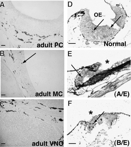 Expression of xOMP-2 in the olfactory organs. Cross-sections of normal adults PC (A), MC (B), VNO (C), the normal olfactory organs in the tadpole at stage 50â51 (D), pA/E- (E), and pB/E (F) -derived EGFP-positive tadpoles with fused nostrils. The sections were hybridized with digoxigenin-labeled xOMP-2-specific antisense probe as described in the Materials and methods. The fused OE (asterisks) and the expression sites of xOMP-2 (arrows) are shown. Bars indicate 50 μm.
