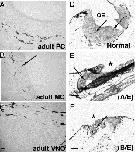 Expression of xOR1 in the olfactory organs. Cross-sections of normal adult principal cavity (PC) (A), middle cavity (MC) (B), VNO (C), the normal OE in the tadpole at stage 50â51 (D), pA/E- (E), and pB/E (F) -derived EGFP-positive tadpoles with fused nostrils. The sections were hybridized with digoxigenin-labeled xOR1-specific antisense probe as described in the Materials and methods. The fused OE (asterisks) and the expression sites of xOR1 (arrows) are shown. Bars indicate 50 μm.