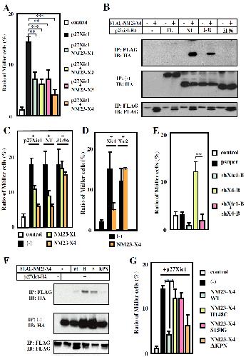 Figure 6. NM23 inhibits p27Xic1-mediated gliogenesis through their interaction. (A) Co-expression of a NM23 member with p27Xic1 inhibits p27Xic1-mediated gliogenesis. (B) Interaction of NM23-X4 with deleted versions of p27Xic1. Full length, amino-terminal NT(1â96), and 1â91 portions of p27Xic1 interact with NM23-X4, but the 31â96 portion does not. (C) The interaction between p27Xic1 and NM23 is responsible for the inhibitory function of NM23 on Müller glial cell phenotype. NM23-X4 blocked glial induction by interacting with the amino-terminal and 1â91 portions of p27Xic1 but not with the 31â96 portion. (D) NM23-X4 cannot inhibit gliogenesis mediated by p16Xic2. Müller glial cell percentage in the retina after co-introduction of NM23-X4 and Xic1 or Xic2. (E) Effect of co-introduction of shX4-B and -B constructs in the retina. Activation of gliogenesis by shX4-B requires p27Xic1. (F) Interaction of p27Xic1 with mutants of NM23-X4. Wild type (wt), H148C (H), S150G (S) and δKPN were tested for their interaction with p27Xic1. (G) Wild type and the δKPN blocked Müller cell induction by p27Xic1, but H148C and S150G did not. Double and triple asterisks correspond to P ⤠0.01, and 0.001, respectively; error bars indicate standard error of the mean. |