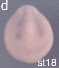 nme4 (NME/NM23 nucleoside diphosphate kinase 4) gene expression in Xenopus laevis embryo, assayed via in situ hybridization, NF stage 18, anterior view, dorsal up. |