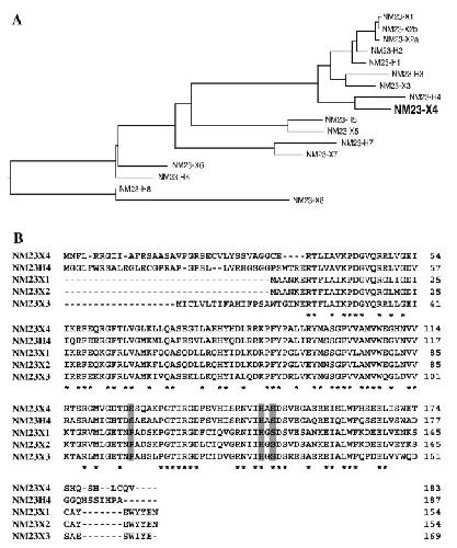 Figure 1. Sequence alignment of NM23-X4. (A) Phylogenetic tree of human and Xenopus NM23 members. The tree was constructed using the Clustal W method with the parameter PAM250. (B) Nucleotide sequence alignment of NM23-X4 with NM23-H4, -X1, -X2, and -X3. Asterisks indicate identical amino acids among all NM23 family members. The previously reported important amino acid residues are shown as shaded boxes. |