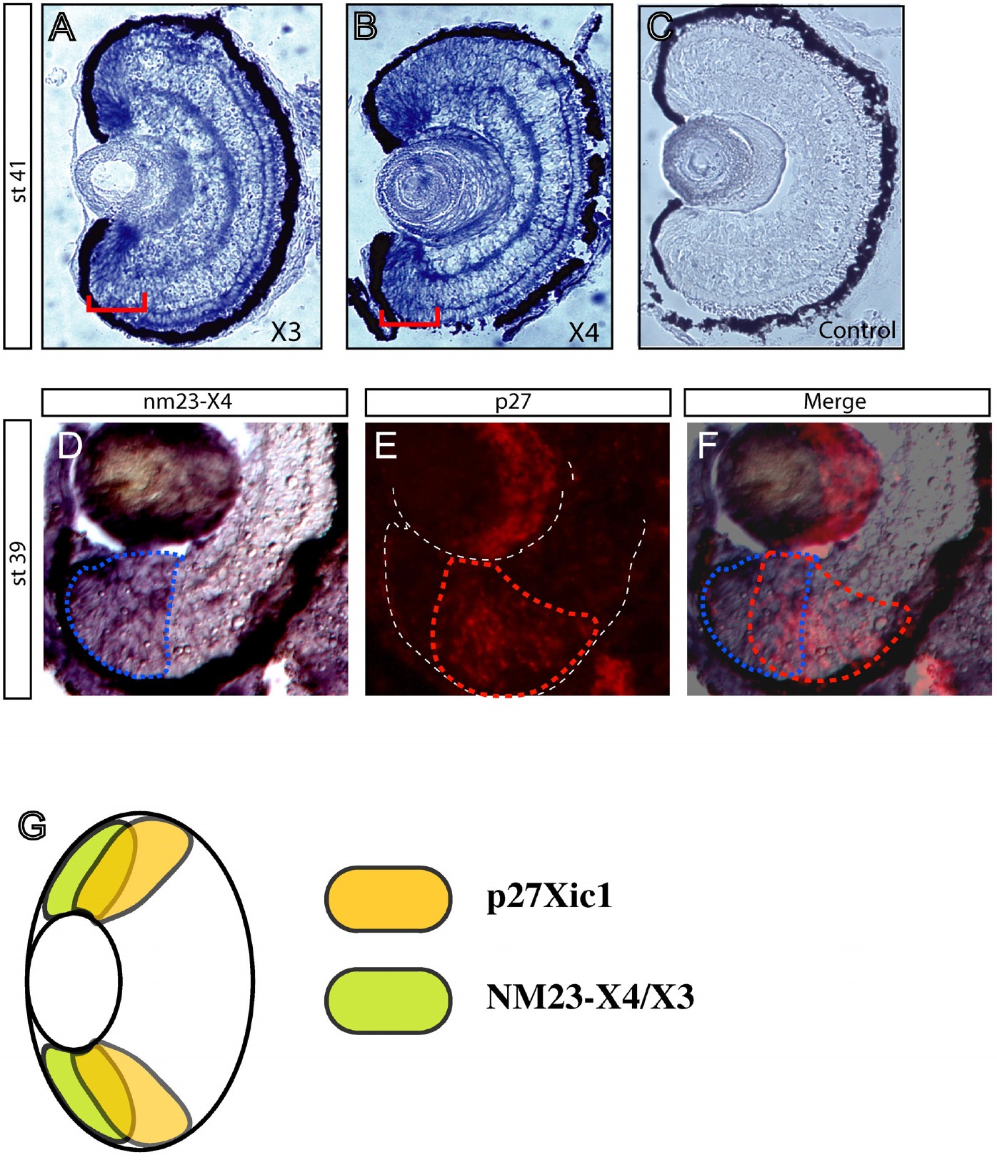 Figure 4. Expression pattern of NM23-X3, -X4 and p27Xic1 in Xenopus retina. (A, B) Both NM23-X3 (A) and NM23-X4 (B) are expressed in the CMZ of Xenopus retina as shown by in situ hybridization on stage 41 cryosections. Red brackets indicate the expressed regions in the CMZ. (C) Sense-probe used as negative control. (D, E) NM23-X4 expression pattern in the retinal CMZ (D) overlaps with that of p27 (E), as underlined by dotted lines in blue and red, respectively. In situ hybridization was done at stage 39 sequential cryosections with signal visualized with BM purple and Fast Red, respectively. (E) Merged image; white dotted line marks the retinal epithelium boundaries. (G) A schematic diagram of expression of p27Xic1 and NM23-X4 or -X3 in embryonic Xenopus retina. |