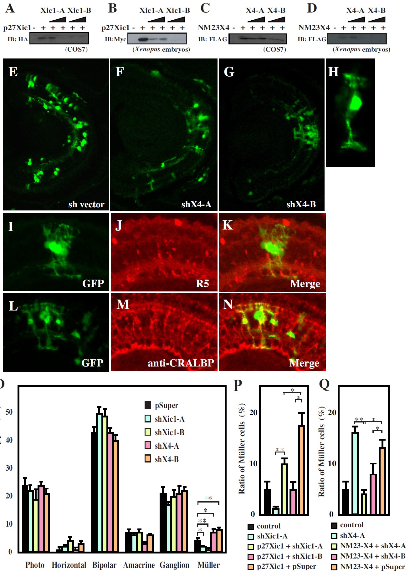 Figure 5. Reduction of NM23-X4 increases the Müller glial cell population. (A-D) shRNAs against p27Xic1 and NM23-X4 are efficient in knocking down their respective protein expression in cell culture and Xenopus embryos. The indicated short hairpin RNA (shRNA) constructs and the corresponding tagged expression constructs were co-transfected in COS7 cells and co-injected in two-cell stage Xenopus embryos. The effect was analyzed by immunoprecipitation of total lysate of cells or embryos (see Materials and methods). (E-G) Stage 41 retinal section after transfecting with pSuper vector and GFP (E), with shX4-A and GFP (F), or with shX4-B and GFP (G). (H) Enlarged view of a green fluorescent protein (GFP)-positive Müller glial cell transfected with shX4-B. (I-K) Staining against the Müller glial marker R5 at stage 41 retina transfected with shX4-B: (I) GFP; (J) R5 staining; (K) merged view. (L-N) Anti-CRALBP staining of Müller glial cells at stage 41 retina transfected with shX4-B: (L) GFP, (M) anti-CRALBP, (N) merged view. (O) Cell type distribution in the stage 41 retina transfected with the indicated construct plus GFP expressed in percentages. (P-Q) Rescue of the knock-down effect in the cell type distribution in the retina by co-introduction of shRNA construct with p27Xic1 (P) and NM23X4 (Q) expression constructs. The Müller glial cell percentages for each condition are shown. Single and double asterisks correspond to P ⤠0.05 and 0.01, respectively; error bars indicate standard error of the mean. |