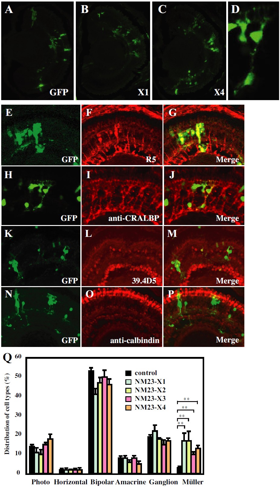 Figure 7. Overexpression of NM23 activates gliogenesis. (A-D) Retinal section at stage 41 after lipofection with GFP (A), NM23-X1 (B), or NM23-X4 (C). A representative image of Müller glial cells in the retina transfected with NM23-X4 and GFP (D). (E-P) Immunostaining of NM23-X4 lipofected retinas with cell specific markers. (E-G) Müller glia staining using R5 antibody: (E) green fluorescent protein (GFP); (F) R5; (G) merged. (H-J) anti-CRALBP staining of Müller glial cells: (H) GFP; (I) anti-CRALBP; (J) merged. (K-M) Ganglion cell staining against islet-1 using 39.4D5 antibody: (K) GFP; (L) 39.4D5 staining; (M) merged. (N-P) Photoreceptor staining with anti-calbindin: (N) GFP; (O) calbindin staining; (P) merged. (Q) Distribution of cell types in the retina after lipofection with NM23 family members. |