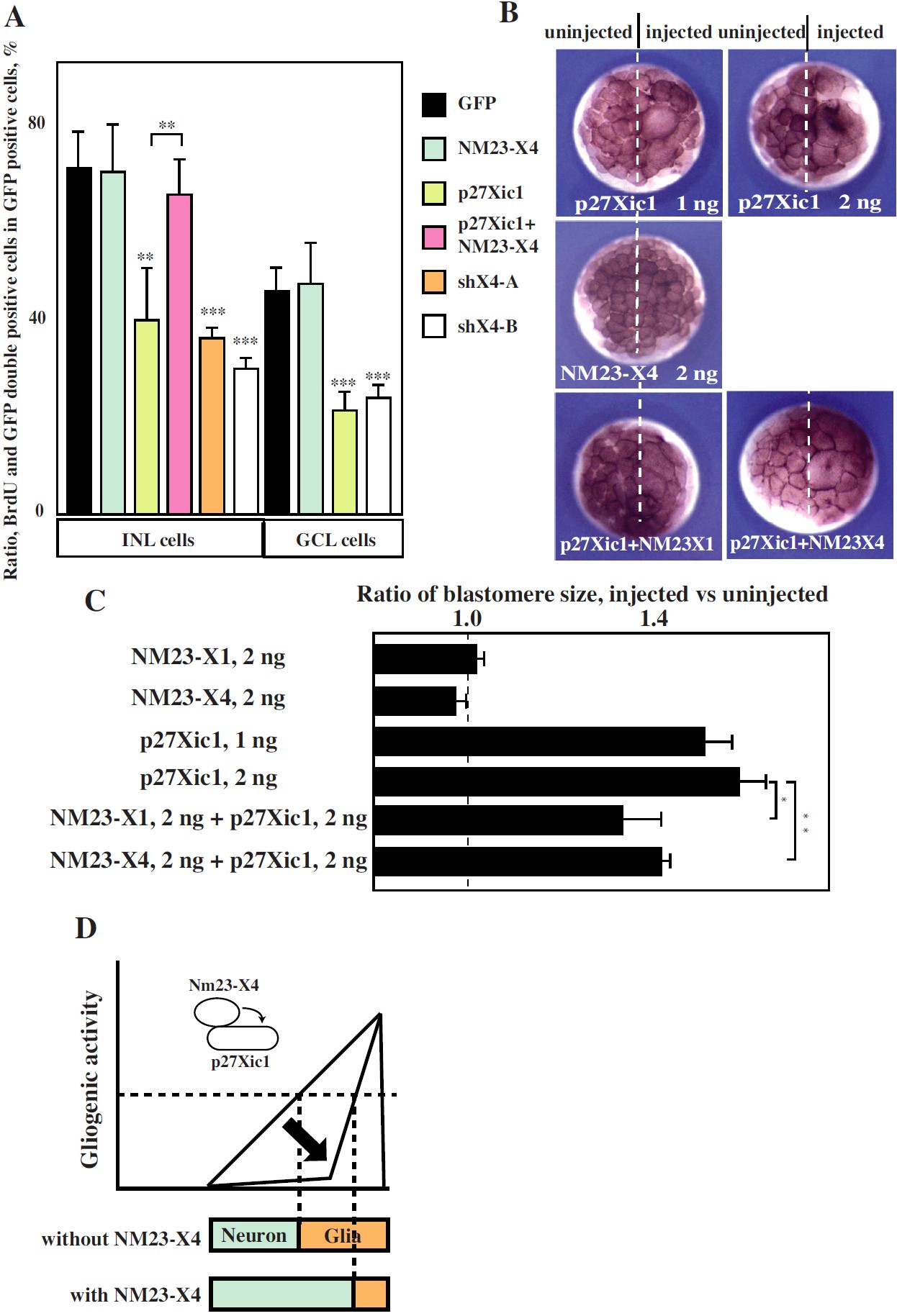 Figure 8. Effect of NM23-X4 on cell cycle regulation. (A) BrdU assay in Xenopus retina. The indicated constructs were co-lipofected with GFP at stage 15. BrdU was injected into embryos from stage 30 to 41 and ratios of BrdU positive cells within GFP positive lipofected cells in the inner nuclear layer (INL) and ganglion cell layer (GCL) were determined as described in the Materials and methods. NM23-X4 does not influence proliferation, while shX4-A and -B reduce the ratio of BrdU positive cells. Co-overexpression of NM23-X4 with p27Xic1 inhibits p27Xic1 mediated cell cycle arrest. (B, C) NM23 can inhibit p27Xic1-mediated cell cycle arrest in early embryos. After mRNA injection into a two-cell stage blastomere, the blastomere size of the injected side was compared with the uninjected side at stage 7. The effect was evaluated and the data are presented in the graph shown in (C). (D) A proposed model for NM23-X4 function in retinal cell fate determination. Both NM23-X4 and p27Xic1 are expressed in the CMZ. NM23-X4 expression starts first and then overlaps with p27Xic1 expression. p27Xic1 expression gradually increases in the CMZ [13]. Gliogenic activity is also gradually activated in the ciliary marginal zone. NM23-X4 inhibits the activity of p27Xic1-mediated gliogenesis at the peripheral side of the p27Xic1-expression domain. This results in proper temporal and spatial regulation of gliogenesis. Single, double and triple asterisks correspond to P ⤠0.05, 0.01, and 0.001, respectively; error bars indicate standard error of the mean. |