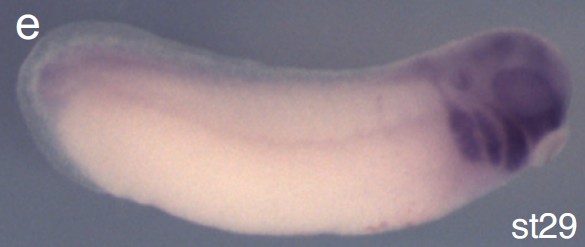 nme4 (NME/NM23 nucleoside diphosphate kinase 4) gene expression in Xenopus laevis embryo, assayed via in situ hybridization, NF stage 29, lateral view, anterior right, dorsal up. |