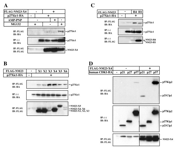 Figure 2. Interaction between NM23 and CDKIs. (A) Co-immunoprecipitation of NM23-X4 and p27Xic1 in COS7 cells. p27Xic1 interacts strongly with NM23-X4 in the presence of the proteasome inhibitor MG132. (B) Interaction of p27Xic1 with NM23-X1, -X2, -X3, -X4, -X5, or -X6. (C) Interaction of p27Xic1 with the human NM23-H1 and -H4 homologs. (D) NM23-X4 interacts strongly with human p21Cip1 and p57Kip2, but not with p27Kip1. All analyses were performed in COS7 cells in the presence of MG132 unless otherwise stated. |