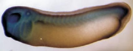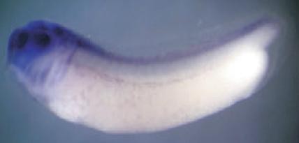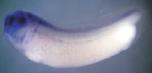 hck (HCK proto-oncogene, Src family tyrosine kinase) gene expression in Xenopus laevis embryos, NF stage 28, as assayed by in situ hybridization, lateral view, anteriorleft, dorsal up.