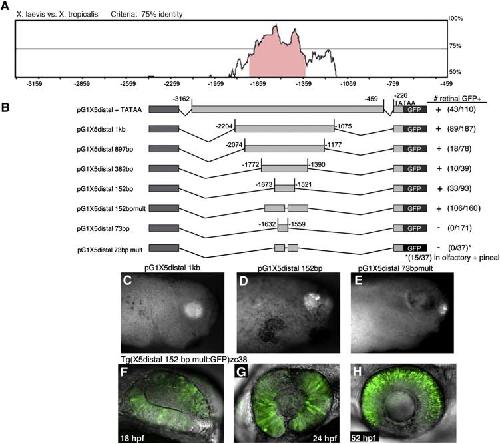Fig. 1. Identification of a conserved minimal Xath5 distal enhancer that promotes retinal expression in vivo. (A) Pairwise mVISTA (http://genome.lbl.gov/vista/index.shtml) analysis of X. laevis and X. tropicalis Xath5 5â² distal noncoding sequences identifies a 1 kb highly conserved region. (B) A series of nested deletion constructs were generated to identify a minimal 152 bp enhancer that is sufficient to promote retinal specific expression. + strong expression, â/+ very weak expression, â no expression (C) A stage 33 pG1X5 distal 1 kb transgenic embryo shows retinal GFP expression. (D) The 152 bp distal enhancer also drives GFP in the retina. (E) A pG1X5 distal 73 bp transgenic embryo does not express GFP in the retina but only expresses in the pineal gland and olfactory placodes. (FâH) The zc38 transgenic zebrafish line exhibits specific expression in the retina as shown in confocal z-projections at 18 hpf (F), 24 hpf (G), 52 hpf (H) Anterior is to the right in all panels. |