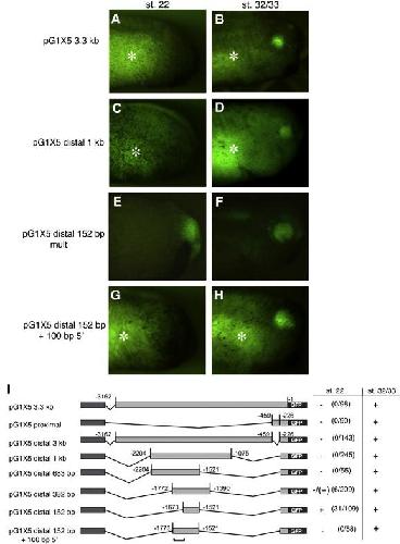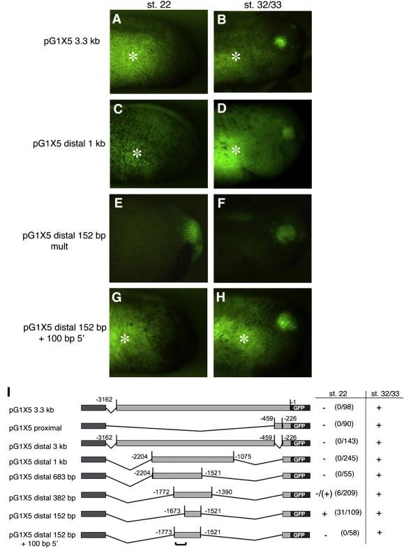 Fig. 2. Expression of the 152 bp distal enhancer is premature compared to endogenous Xath5 expression and an additional 100 bp prevents premature transgene expression. (AâB) pG1 X5 3.3 kb and (CâD) X5 distal 1 kb embryos do not begin expressing GFP in the retina until after stage 22. (EâF) The X5 distal 152 bp mult transgenic embryos express GFP in the retina at both stage 22 and stage 32/33. Addition of 100 bp of sequence 5â² to the distal enhancer prevents premature expression (GâH). Each embryo was imaged at stage 22 and again at stage 32/33. Marks gut autofluorescence. (I) Deletion constructs were assayed for retinal GFP expression at stage 22 identifying a 100 bp region that inhibits precocious expression (marked by bracket). + strong expression, â/+ very weak expression, â no expression. |