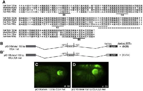 Fig. 3. The 152 bp Xath5 distal enhancer does not depend upon conserved E-boxes. (A) ClustalW alignment of the 152 bp distal enhancer sequence between human, mouse, chick and X. laevis shows blocks of highly conserved sequence (gray). Black lines mark the 4 conserved E-boxes in this region (CANNTG). + strong expression. Mutation of E-boxes E3 and E4 (B) or all 4 E-boxes E3âE6 (Bâ²) does not reduce retinal GFP expression in transgenic embryos. (C) A stage 33 pG1X5 distal 152 bp E3,4 mut embryo shows GFP expression in the retina. (D) A stage 33 pG1X5 distal 152 bp E3,4,5,6 mut embryo show GFP expression in the retina as well as ectopic expression in the neural tube and cranial ganglia. Dashed lines mark the 2 overlapping Pax6 sites in the distal enhancer. |