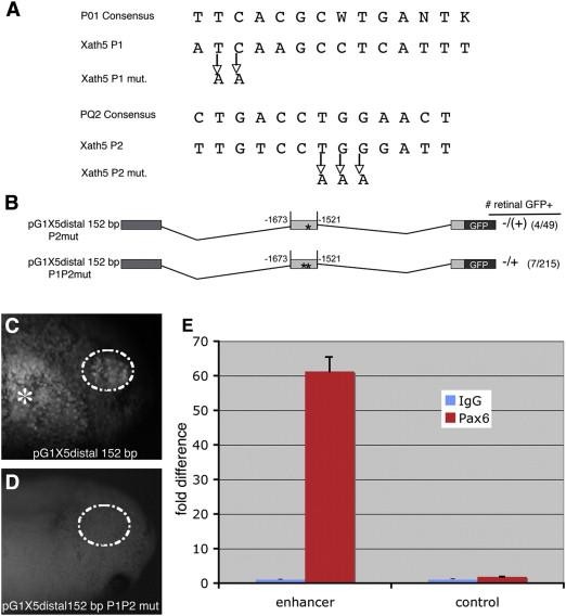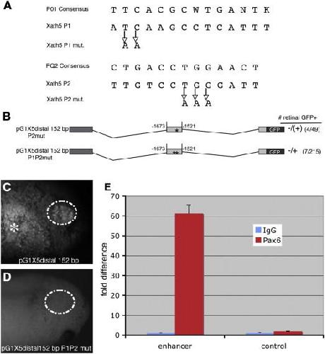 Fig. 5. Expression of the 152 bp distal enhancer is dependent upon conserved Pax6 sites and Pax6 binds to this region in vivo. (A) Sequence from the Xenopus laevis 152 bp enhancer region showing the 2 overlapping Pax6 sites identified using Transfac MATCH version 10.3 (http://www.gene-regulation.com/pub/databases.html#transfac). P1 aligns with the Pax6_01 matrix, while P2 aligns with the Pax6_Q2 matrix. (B) Mutation of one Pax6 site dramatically reduces (â/+) while mutation of both Pax6 sites in the 152 bp distal enhancer results in retinal GFP expression in only a few cells (â/(+)) in transgenic embryos. (C) A stage 33 pG1X5 distal 152 bp transgenic embryo shows strong GFP expression in the retina. (D) A stage 33 pG1X5 distal 152 bp P1P2 mut transgenic embryo does not have retinal GFP expression. (E) ChIP showing Pax6 binds to the distal enhancer region in vivo (group student t test PÂ =Â 0.002 for enhancer region (IgG vs. Pax6 antibody), and 0.056 for the GFP coding region (IgG vs. Pax6 antibody)). Error bars represent standard deviation. Gut autofluorescence. |