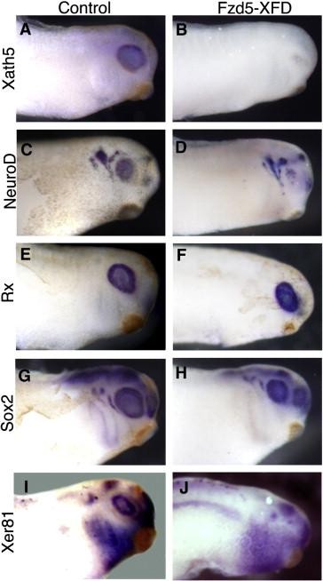 Fig. 6. Endogenous Xath5 expression is regulated by FGF signaling. Stage 28 Fzd5-XFD transgenic embryos show decreased expression of bHLH transcription factors Xath5 (B), NeuroD (D) vs. non-transgenic controls (A, C). The expression of retinal progenitor genes Rx (EâF), and Sox2 (GâH) is not affected. Retinal expression of Xer81 is inhibited in Fz5-XFD transgenic embryos (J) vs. non-transgenic controls (I). |