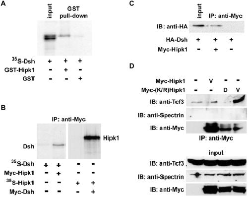 Figure 1. Hipk1 interacts with Dsh and Tcf3.(A) 35S-Met-labelled Dsh precipitates in a complex with the partial-length Hipk1 GST-tagged clone from the yeast-2-hybrid screen, but not with GST alone. (B) Immunoprecipitation (IP) of 35S-Met-labelled Dsh with Myc-tagged Hipk1 (left panel), and reciprocal 35S-Met-labelled Hipk1 IP with Myc-tagged Dsh (right panel), using in vitro translated proteins. (C) IP of Dsh with Hipk1 when both proteins are recombinantly expressed in X. laevis embryos. (D) Endogenous Tcf3 IP with recombinantly expressed Myc-(K/R) Hipk1 in ventral X. laevis embryos. An anti-Spectrin antibody was used as a negative control for the IP (top) and as a loading control for the input (bottom). |