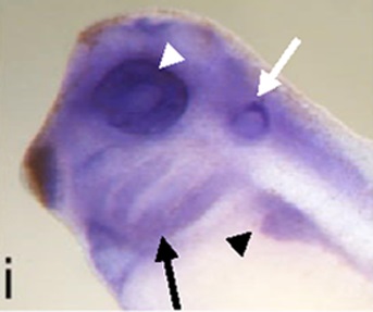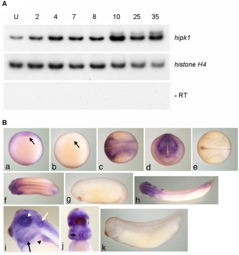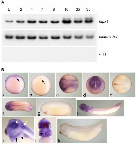 Figure 2. Hipk1 is expressed throughout vertebrate development.(A) Levels of the X. laevis hipk1 mRNA were measured by RT-PCR at the following developmental stages: Unfertilized egg (U), 2-cell (2), 4-cell (4), blastula (Stage 7, 8), gastrula (Stage 10), neurula (Stage 17), tail bud (Stage 25), and early tadpole (Stage 35). Histone H4 was used as a loading control, and reactions without reverse transcriptase (âRT) performed to rule out genomic DNA contamination. (B) WISH of the hipk1 transcript during X. laevis development. At Stage 10 (a, ventral aspect) signal is detected in the marginal zone and animal pole with greater staining above the dorsal lip of the blastopore (arrow). At Stage 17 (c, dorsal aspect; d, anterior aspect) signal is apparent at the margins of the lateral and anterior neural plate. At Stage 25 (f) and Stage 35 (h), signal is present in dorsal anterior regions and in the tail bud. Close-up of the Stage 35 head (i, lateral aspect) reveals expression in the branchial arches (black arrow), otic vesicle especially dorsally (white arrow), pronephros (black arrowhead), and retina (white arrowhead). Close-up of the Stage 35 head/torso (j, ventral aspect) shows high expression in the heart (arrow). Sense controls (b, e, g, k). |