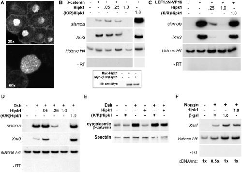 Figure 4. Hipk1 is nuclear and acts at the level of transcription during X. laevis development.(A) Confocal micrographs of animal pole explants recombinantly expressing Myc-tagged Hipk1 and visualized with anti-Myc antibody. Hipk1 localizes strongly to the nucleus and nuclear speckles, with low-levels of apparent extra-nuclear signal near the plasma membrane. (BâD) Hipk1 over-expression blocks activation of the Wnt-responsive genes siamois and Xnr3 downstream of β-catenin (B), Lef/Tcf (C), and Dsh (D). X. laevis embryos were uninjected (lanes furthest on left in all panels) or injected with synthetic RNAs encoding β-catenin (B), LEF1δN-VP16 (C) or Dsh (D). Nanogram quantities of RNAs encoding Myc-Hipk1, Myc-(K/R)Hipk1 or β-galactosidase were co-injected as indicated. RT-PCR was used to assess target gene activation; histone H4 was assessed as a loading control, and reactions without reverse transcriptase (âRT) performed to rule out genomic DNA contamination. (B, inset) Myc-tagged Hipk1 and (K/R)Hipk1, injected at 1 ng per blastomere, are expressed at comparable levels in X. laevis as demonstrated by western blot. (E) Over-expression of Dsh in HEK293T cells leads to an increase in cytoplasmic β-catenin that is not affected either positively or negatively by over-expression of Hipk1. (F) Induction of Xanf by Noggin in X. laevis animal caps is not affected by over-expression of Hipk1. |