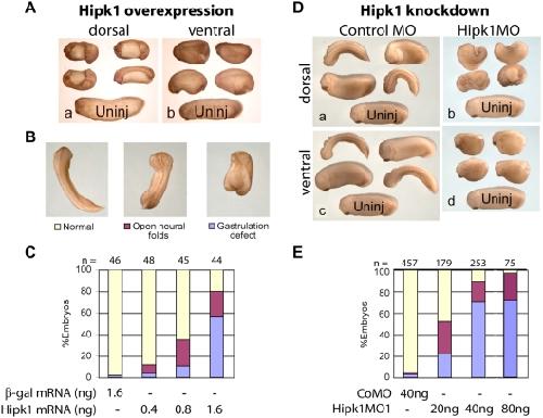 Figure 5. Hipk1 over-expression and knock-down both produce gastrulation and neural tube defects.(A) Over-expression of Hipk1 dorsally results in shortened embryos with gastrulation defects and an open neural tube both anteriorly and posteriorly (a). When Hipk1 is over-expressed ventrally, the neural tube closes, but embryos are shortened and fail to complete blastopore closure (b). Synthetic Hipk1 RNA was injected into the marginal zone of 2 dorsal or 2 ventral blastomeres at the 4-cell stage. An uninjected (Uninj) control embryo is shown at the bottom of each panel for comparison. (B) Representative phenotypes used for quantification in C and E. (C) Graphical representation of phenotype distribution resulting from increasing quantities of Hipk1 RNA injected into the DMZ. (D) Injection of Hipk1MO results in gastrulation defects and an open neural tube similar to the over-expression phenotypes in AâC. CoMO (a, c) or Hipk1MO (b, d) was injected either dorsally (a, b), or ventrally (c, d). Embryos injected with the control morpholino did not differ from uninjected embryos (Uninj) shown at the bottom of each panel. (E) Hipk1MO produces gastrulation defects in a dose-dependent manner. Anterior is to the left in A, D, and at the top in B. |