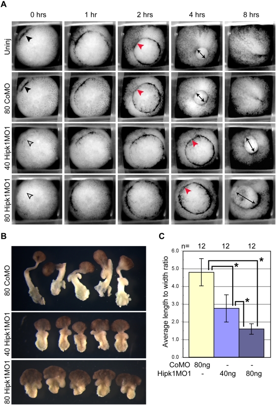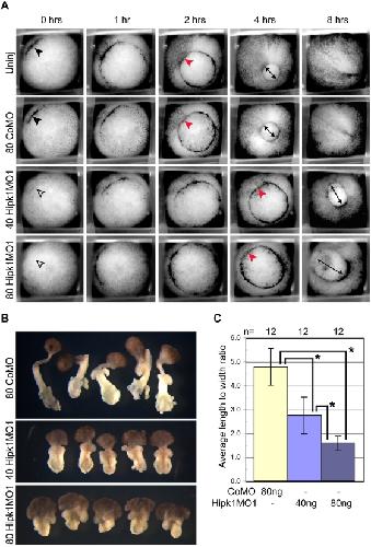 Figure 6. Hipk1 is required for gastrulation and convergent extension movements.Morpholino-mediated knock-down of Hipk1 perturbs initiation and progression of gastrulation. (A) Hipk1 morphant embryos exhibit delay of dorsal blastopore lip formation and do not close the blastopore compared to controls (see text). Frames from movies of gastrulating embryos in parallel are presented, from embryos that were either uninjected (Uninj) or injected in the DMZ at the 4-cell stage with 80 ng of CoMo, 40 ng of Hipk1MO1, or 80 ng of Hipk1MO1 as labeled. Elapsed time after appearance of the dorsal lip (black arrowhead) in controls (0 hrs) is indicated. See text for details. (B and C) Keller explant sandwiches from Hipk1 morphant embryos exhibit dose-dependent failure of convergent extension movements compared to controls. DMZ explants were cultured as sandwiches to Stage 19 and average LWR determined. LWR was significantly decreased in Hipk1 morphants compared to controls, and this was dose-dependent (*Pr(T>t)â=â0.00001 using 2-sample t test with equal variances). |