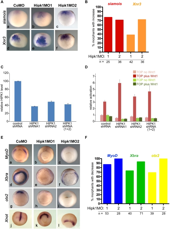 Figure 3. Hipk1 regulates Wnt/β-catenin targets in the early embryo.(A) Morpholinos against Hipk1 expand expression domains of the Wnt-responsive dorsal patterning genes siamois (aâc) and Xnr3 (dâf). Embryos were injected with CoMO (40 ng per embryo), Hipk1MO1 (40 ng per embryo), or Hipk1MO2 (20 ng per embryo) in the DMZ of 2 dorsal blastomeres at the 4-cell stage. (B) Quantification of results in A. (C, D) ShRNA plasmids targeted against HIPK1 reduce HIPK1 levels in human embryonic kidney cells (C) and potentiate the response of a β-catenin reporter construct to co-transfected Wnt1 (D). (E) Morpholinos against Hipk1 eliminate or reduce expression of the Wnt-responsive genes MyoD (aâc) Xbra (dâf), and otx2 (gâi), but do not similarly eliminate expression of Xnot (jâl), a marker for axial mesoderm. Embryos were injected as in A. (F) Quantification of results in E. |