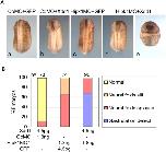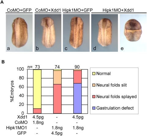 Figure 7. Hipk1 knock-down and Xdd1 over-expression synergize to perturb gastrulation.(A) Reduction of Hipk1 levels by morpholino, or interference with Dsh function by expression of a dominant negative protein (Xdd1), each produce no gastrulation defects at low doses, with only mild neural tube closure defects (b, c vs. control a). Combining these low-dose treatments produces gastrulation defects plus more severe neural tube closure defects (d, e). (B) Gastrulation defects are present in 68% of embryos in the Xdd1+Hipk1MO group, but not at all in groups injected with either Xdd1 RNA or Hipk1MO alone. |